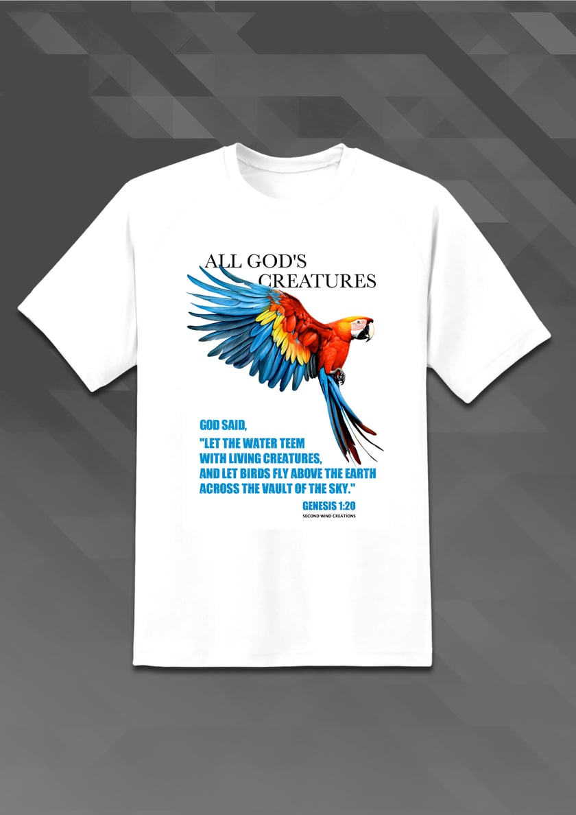 As part of our “All God’s Creation Series” we thought it appropriate to honor the beauty the Lord put into the making of birds. Our hope is this shirt will testify to God’s handiwork.