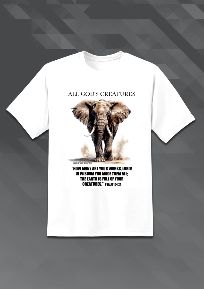All God’s Creatures series includes this dramatic view of an Elephant coming your way. This shirt is currently only available in white and offers a visual way to proclaim the glory of God’s creation.